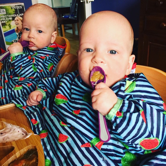 I’ve been amazed so far at the sophistication of their pallet! Smoked haddock, chicken liver pate (before I read that it’s not allowed until after 12 months – oops!), taramasalata, hard boiled egg, celery, broccoli, houmous – it’s a wonder I’ve managed to lose any weight as the temptation to pop their leftovers in my mouth is far too great to resist! I’ll be the size of a house unless they start getting more in their mouths before too long!